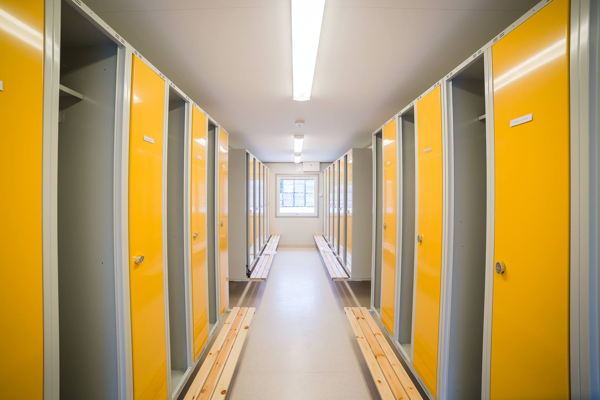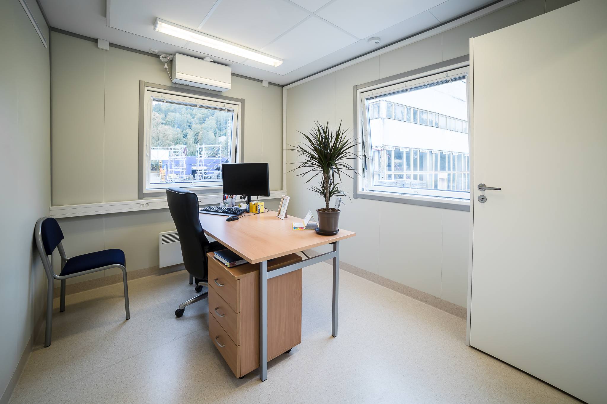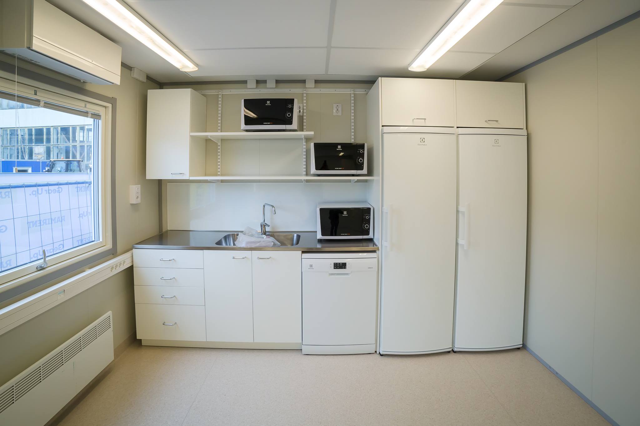 We have created a green and ecologically sustainable module complex that exceeds the current requirements for temporary buildings. This modern building is equipped with central heating and hot water solution. It has energy efficient air to water heat pumps and in addition there is also a central heat exchanger ventilation system.