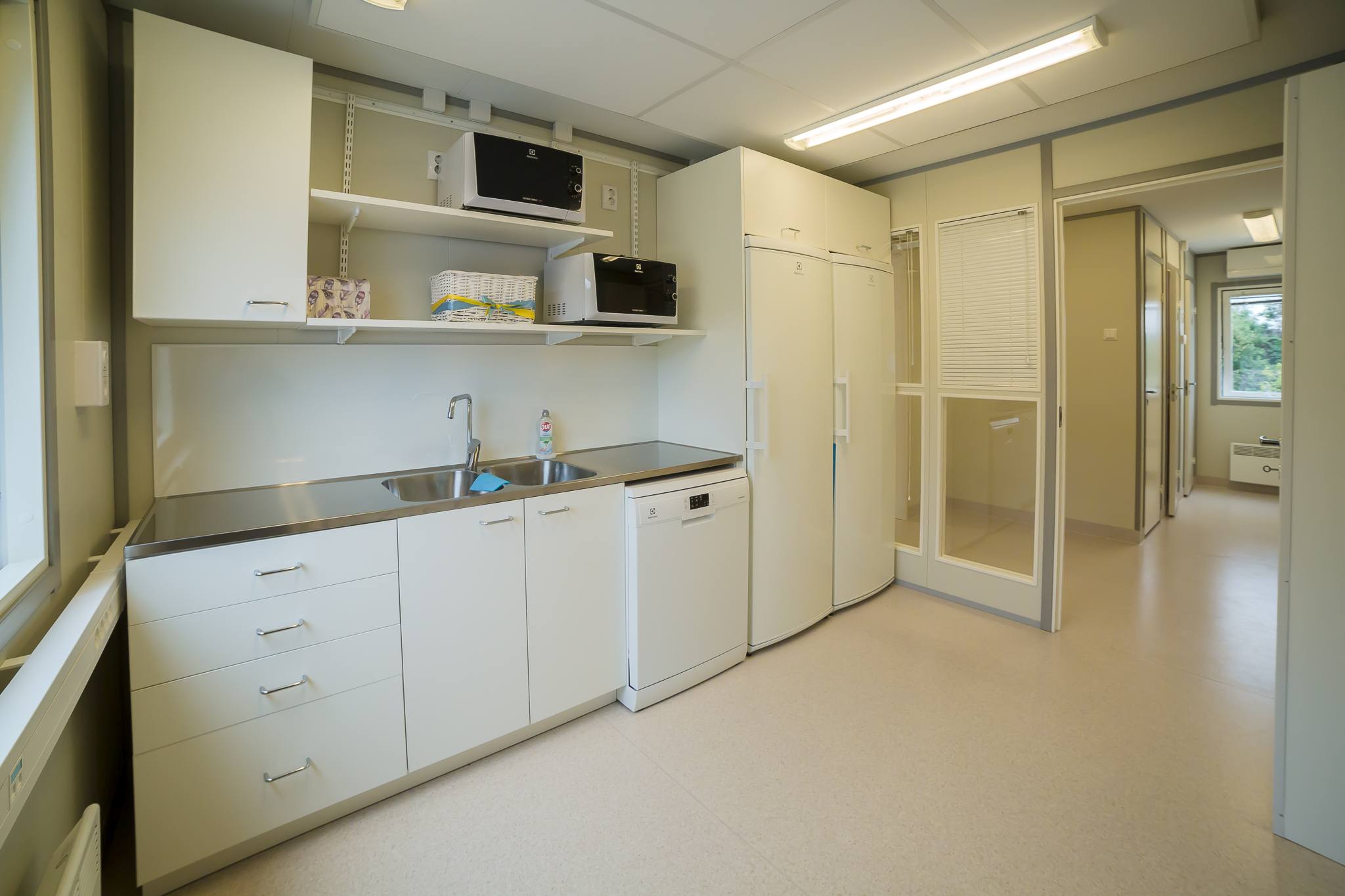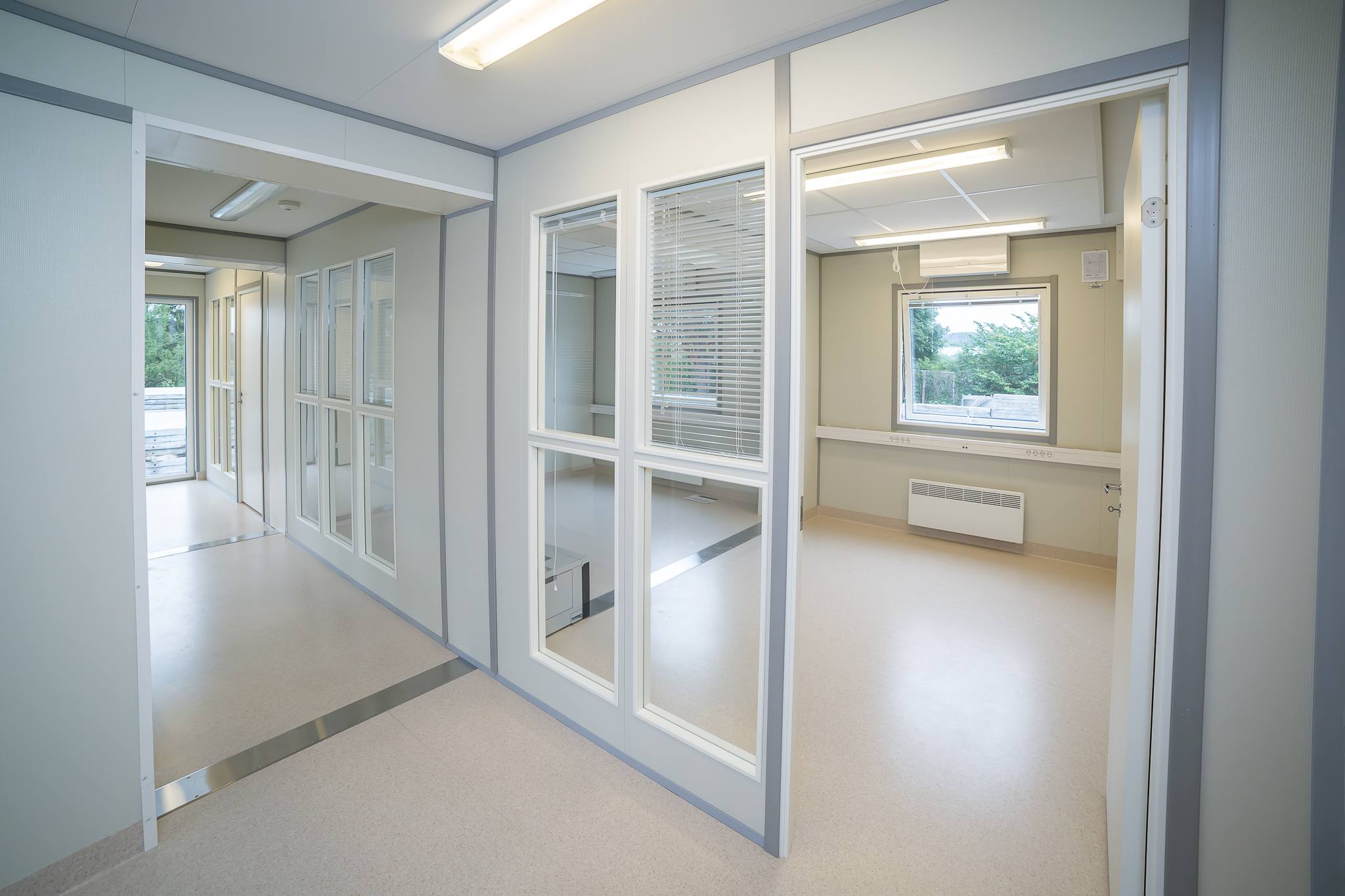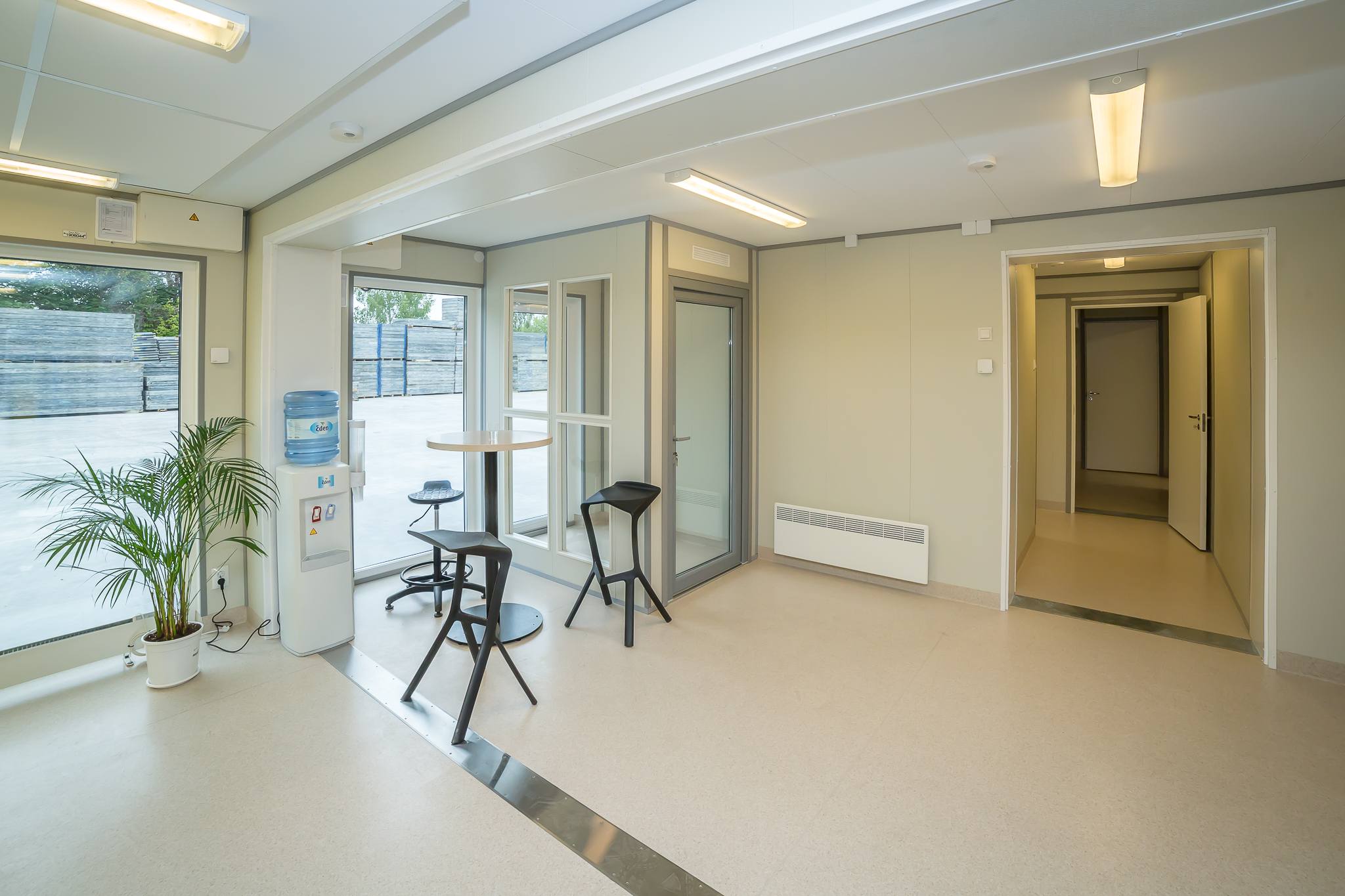 We have created a green and ecologically sustainable module complex that exceeds the current requirements for temporary buildings. This modern building is equipped with central heating and hot water solution. It has energy efficient air to water heat pumps and in addition there is also a central heat exchanger ventilation system.